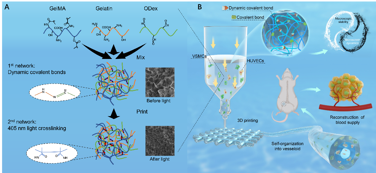 血管化是目前限制大尺寸組織工程支架構(gòu)建的關(guān)鍵問題。盡管近年來人工血管/血管網(wǎng)絡(luò)的生物制造技術(shù)獲得了巨大的發(fā)展,但構(gòu)建具備仿生結(jié)構(gòu)以及收縮功能的血管網(wǎng)絡(luò)一直是領(lǐng)域重大挑戰(zhàn)。為解決上述問題,研究團(tuán)隊(duì)開發(fā)了一種具有動(dòng)態(tài)共價(jià)交聯(lián)網(wǎng)絡(luò)的仿ECM生物墨水,通過模擬ECM的適應(yīng)性微環(huán)境和結(jié)構(gòu)組分,引導(dǎo)血管內(nèi)皮細(xì)胞和血管平滑肌細(xì)胞自發(fā)排列形成具有仿生雙層結(jié)構(gòu)的血管網(wǎng)絡(luò)。
