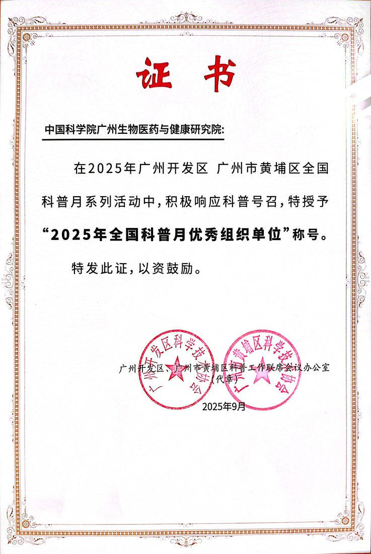 近日,中國科學(xué)院廣州生物醫(yī)藥與健康研究院(以下簡稱 “廣州健康院”)憑借在全國首個科普月期間的出色組織能力、豐富活動形式及顯著社會成效,獲得黃埔區(qū)授予的“2025年全國科普月優(yōu)秀組織單位”稱號。