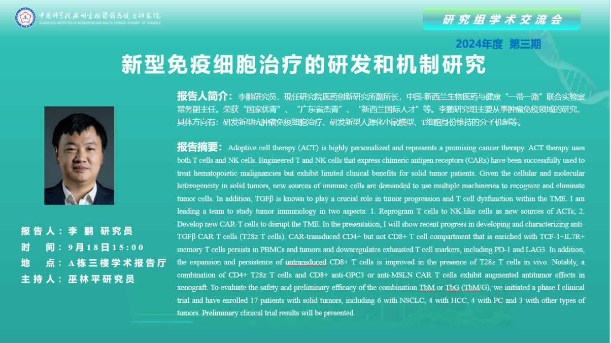 2024年9月18日研究組學(xué)術(shù)交流會(huì)(2024年第三期):新型免疫細(xì)胞治療的研發(fā)和機(jī)制研究